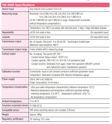 Thông số kỹ thuật thiết bị đo điện trở suất Online Horiba HE-480R