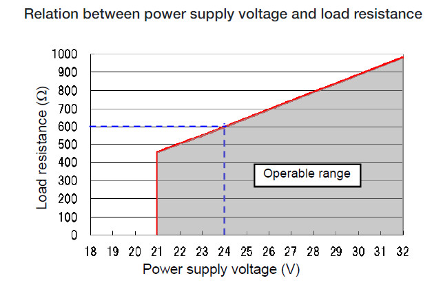 - Điện trở tải tối đa có thể được kết nối được quyết định tùy thuộc vào điện áp nguồn cung cấp.