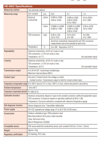 - Thông số kỹ thuật thiết bị đo độ dẫn điện Online Horiba HE-300C