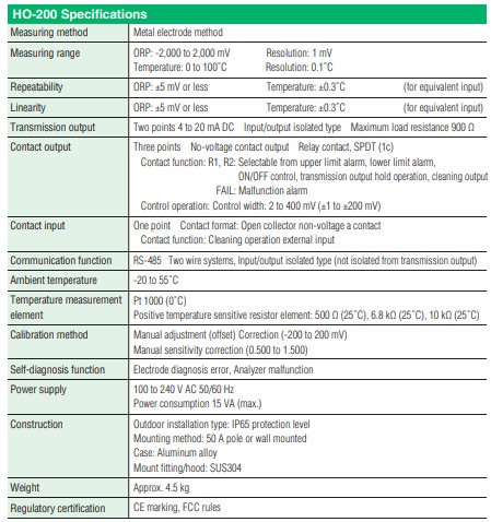 +Thông số kỹ thuật thiết bị đo ORP Online Horiba HO-200 (truyền bốn dây)